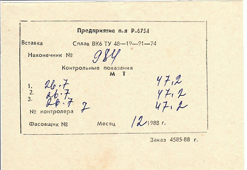 | 1 | Наконечник твердосплавный ВК-6 | 1 шт. |