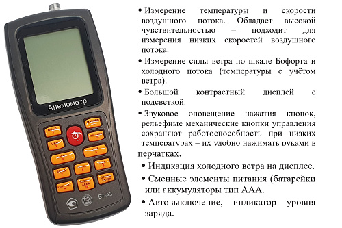 Диапазон измерения величины «холодный ветер», °С - В7-А10 (разрешение 0,1 °С, погрешность ±2 °С, время отклика 1 с) |